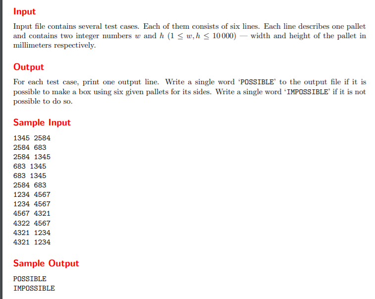 #include<iostream> using namespace std; #include<algorithm> int main(void) { while (1) { pair<int, int> p[6]; for (int i = 0; i < 6; i++) { if (cin >> p[i].first >> p[i].second) { if (p[i].first > p[i].second) { swap(p[i].first, p[i].second); } } else return 0; } sort(p, p + 6); puts(p[0].first == p[1].first && p[0].first == p[2].first && p[0].first == p[3].first && p[0].second == p[1].second && p[0].second == p[4].first && p[0].second == p[5].first && p[2].second == p[3].second && p[2].second == p[4].second && p[2].second == p[5].second ? "POSSIBLE" : "IMPOSSIBLE"); } return 0; }