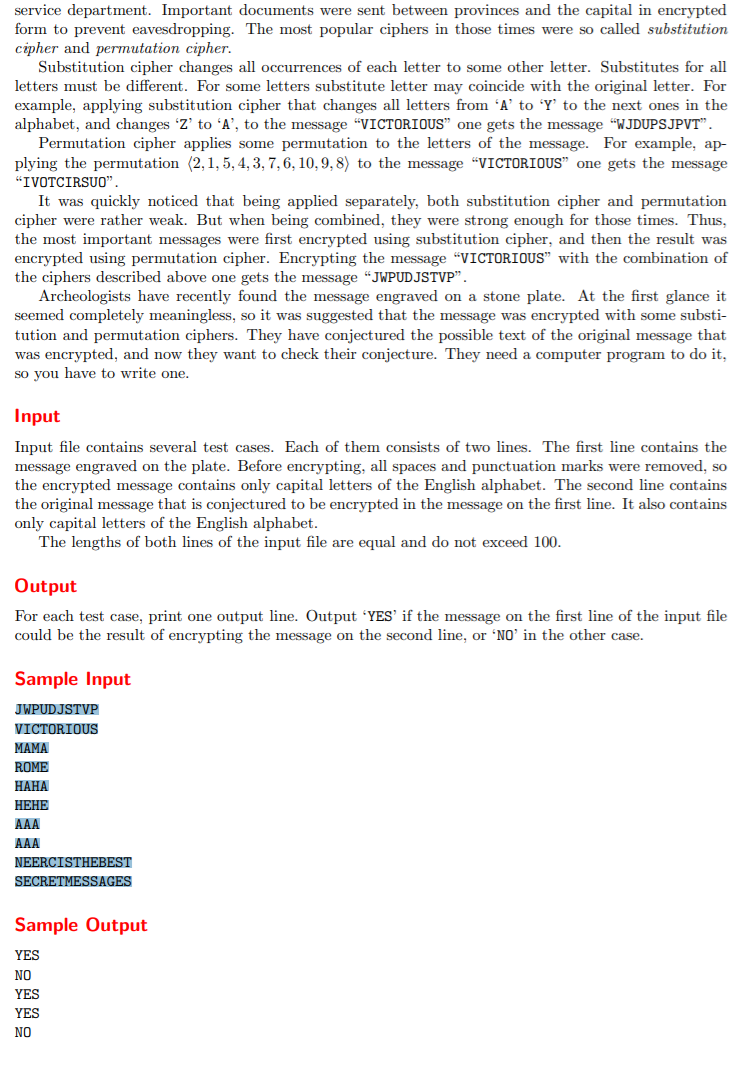 写在前排,该题替换不是凯撒密码!不是凯撒密码!不是凯撒密码!我看了很长时间终于理解题意,既然可以随便重排,那么我们可以直接找出两个字符串对应的字母的数量,都排序后,比较两个数组是否相同,如果相同说明可以通过替换让它们的字母一一对应,否则输出NO,题中替换的意思是,每个字母的所有项都改变为其他字母,但每个字母替代的字母不能相同,但有的字母可以是自己本身,注意每个字母都需要替换,只不过有的可能是替换为本身