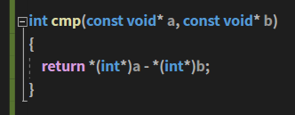 const void *a是指向常数的万能指针,他可以通过强制类型转化变成任意类型的指针,然后把参数a和b转化为真实的数据,然后让cmp函数当a<b,a=b和a>b时返回负数、0、和正数即可