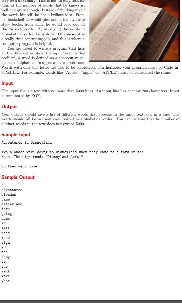 #include<cstdio> #include<iostream> using namespace std; #include<set> #include<sstream> int main(void) { set<string> sp;//set容器类似于集合,不会出现相同的值,并且会自动将值从大到小排列 string m; while (cin >> m) { for (int i = 0; i < m.size(); i++) if (isalpha(m[i])) m[i] = tolower(m[i]); else m[i] = ' '; stringstream ss; //stringstream是以空格来分隔的 ss << m; string n; while (ss >> n) sp.insert(n); } for (set<string>::iterator it = sp.begin(); it != sp.end(); it++) { cout << *it << endl; } return 0; }