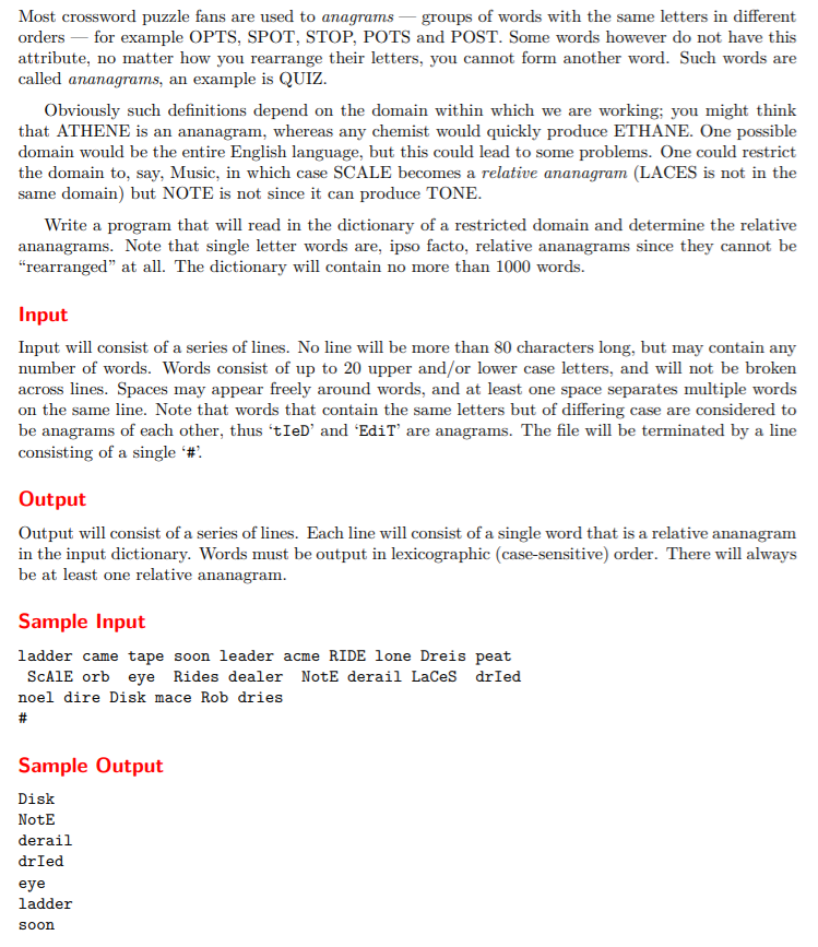 #include<cstdio> #include<iostream> using namespace std; #include<map> #include<cctype> #include<algorithm> #include<vector> map<string, int > mp; string trans(const string& s)//大写转小写并排序 { string ans = s; for (int i = 0; i < ans.size(); i++) { ans[i] = tolower(ans[i]); } sort(ans.begin(), ans.end()); return ans; } int main(void) { vector<string> v; string s; while (cin >> s && s != "#") { v.push_back(s); mp[trans(s)]++; } vector<string> ans; for (int i = 0; i < v.size(); i++) if (mp[trans(v[i])] == 1) ans.push_back(v[i]); //如果数量为1就保存在ans中,说明这个字典中该词不能重排 sort(ans.begin(), ans.end()); for (int i = 0; i < ans.size(); i++) cout << ans[i] << endl; return 0; }