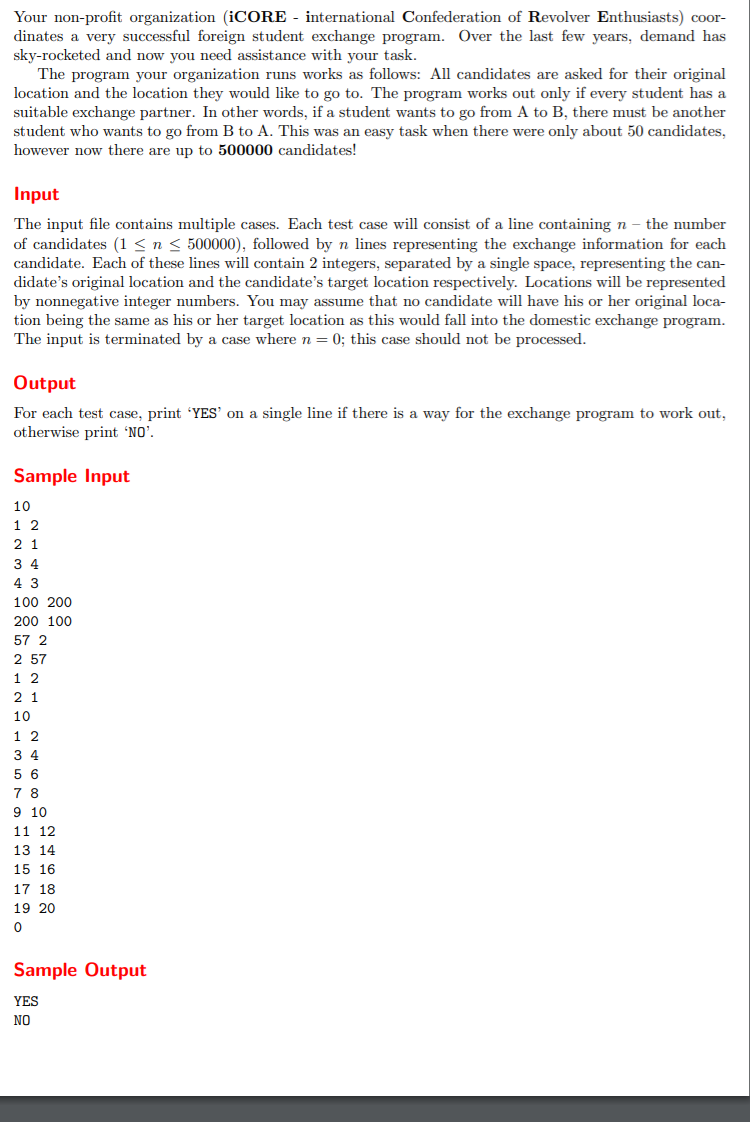 #include<iostream> using namespace std; #include<cstdio> #include<map> typedef pair<int, int> pa; int main(void) { int n; while (cin >> n && n) { int a, b; map<pa, int> mp; while (n--) { cin >> a >> b; mp[{a, b}]++; } int q = 1;//记录是否可以交换 for (map<pa, int>::iterator it = mp.begin(); it != mp.end(); it++) { if (mp.count({ it->first.second,it->first.first })) { if (mp[{it->first.first, it->first.second}] != mp[{it->first.second, it->first.first}]) { q = 0; break; } } else { q = 0; break; } } if (q)cout << "YES" << endl; else cout << "NO" << endl; } return 0; }