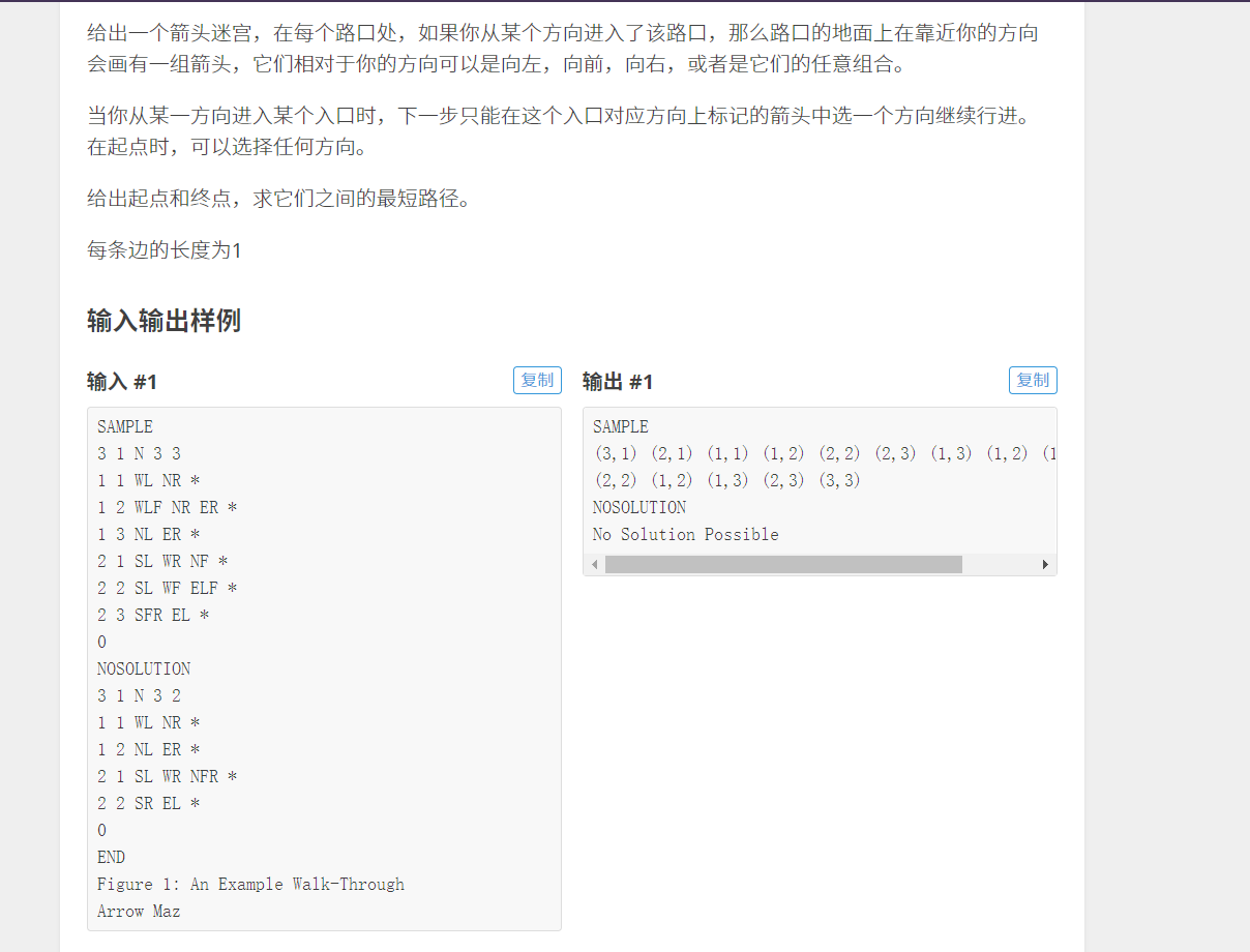 #include<cstdio> #include<cstring> #include<iostream> #include<vector> #include<queue> using namespace std; struct Node//每一个结点的属性 { int r,c,dir; Node(int a = 0,int b = 0 ,int c = 0):r(a),c(b),dir(c){} }; int has_eage[100][100][4][3];//记录每个结点以该朝向进来后可以如何转向 Node p[100][100][4]; int d[100][100][4];//用于记录到达该条路线的最短长度,也是防止重复走该路的方法 int r1, c1, dir;//起始位置和朝向 int r2, c2;//终止位置和朝向 const char* dirs = "NESW";//分别代表上右下左 const char* turns = "FLR";//分别代表进入一个结点时该如何走 int dr[] = { -1,0,1,0 }; int dc[] = { 0,1,0,-1 };//根据朝向和转弯方式来移动行列s int T(char s) { if (s == 'F')return 0; else if (s == 'L') return 1; else if (s == 'R') return 2; } int D(char s) { if (s == 'N') return 0; else if (s == 'E') return 1; else if (s == 'S') return 2; else if (s == 'W') return 3; } Node walk(Node u,int turn)//修改结点的位置与方向 { if (turn == 1)u.dir = (u.dir + 3) % 4; if (turn == 2)u.dir = (u.dir + 1) % 4; return Node(u.r + dr[u.dir], u.c + dc[u.dir], u.dir); } void print_ans(Node s)//打印最后结果 { vector<Node> v; while (true) { v.push_back(s); if (d[s.r][s.c][s.dir] == 0) break; s = p[s.r][s.c][s.dir]; } v.push_back(Node(r1, c1, dir)); int cnt = 0; for (int i = v.size() - 1; i >= 0; i--) { if (cnt % 10 == 0) printf(" "); printf(" (%d,%d)", v[i].r, v[i].c); if ((++cnt)% 10 ==0) puts(""); } if (v.size() % 10 != 0)printf("\n"); } void bfs() { queue<Node> q; Node u(r1, c1, dir); q.push(u); memset(d, -1, sizeof(d)); int h = 0; while (!q.empty()) { Node u = q.front(); q.pop(); if(h) if (u.r == r2 && u.c == c2) { print_ans(u); return; } if(h++) for (int i = 0; i < 3; i++) { Node v = walk(u,i); if (has_eage[u.r][u.c][u.dir][i]&&d[v.r][v.c][v.dir]<0) { d[v.r][v.c][v.dir] = d[u.r][u.c][u.dir] + 1; p[v.r][v.c][v.dir] = u; q.push(v); } } else { Node v = walk(u, 0); d[v.r][v.c][v.dir] = d[u.r][u.c][u.dir] + 1; p[v.r][v.c][v.dir] = u; q.push(v); } } printf(" "); printf(" No Solution Possible\n"); } int main(void) { //int has_eage[100][100][4][3];//记录每个结点以该朝向进来后可以如何转向 //Node p[100][100][4]; //int d[100][100][4]; string m; while (cin >> m && m != "END") { memset(has_eage, 0, sizeof(has_eage)); memset(p, 0, sizeof(p)); cout << m << endl; int a = 1, b = 1; char s; cin >> r1 >> c1 >> s >> r2 >> c2; dir = D(s); has_eage[r1][c1][dir][0] = 1; while (cin >> a && a) { cin >> b; string s; //将has_eage中结点的转向记录 while (cin >> s && s != "*") { for (int i = 0; i < 4; i++) { if (*(dirs + i) == s[0]) { for (int j = 1; j < s.size(); j++) { int t = T(s[j]); has_eage[a][b][i][t] = 1; } break; } } } } bfs(); } return 0; }
