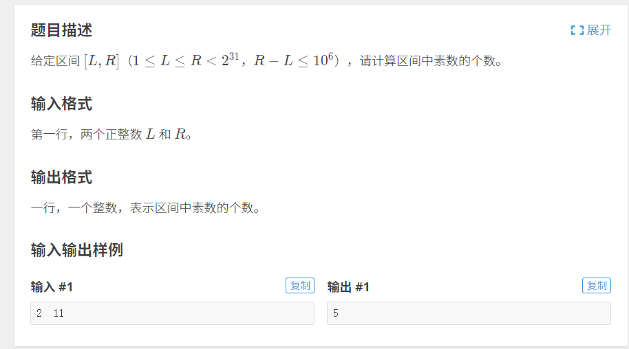 #include<cstdio> #include<algorithm> #include<iostream> #include<cstring> using namespace std; const int maxn = 1000010; int pri[10000]; bool a[maxn]; int Eratosthenes_Sieve(int n, int pri[]) { a[0] = a[1] = 1; for (int i = 2; i * i <= n; i++) { if (!a[i]) { for (int j = i << 1; j <= n; j += i) { a[j] = 1; } } } int cnt = 0; for (int i = 2; i <= n; i++) { if (!a[i])pri[cnt++] = i; } return cnt; } //typedef long long ll; int main(void) { long long L, R; scanf("%lld %lld", &L, &R); int cnt = Eratosthenes_Sieve(50000, pri); //cout << cnt; memset(a, 0, sizeof(a)); for (int i = 0; i < cnt; i++) { for (long long j = max(2ll, ((L - 1) / pri[i] + 1)) * pri[i]; j <= R; j += pri[i]) { a[j - L] = 1; } } if (L == 1)a[0] = 1; int ans = 0; for (long long i = L; i <= R; i++) { if (!a[i - L])ans++; } cout << ans; return 0; }