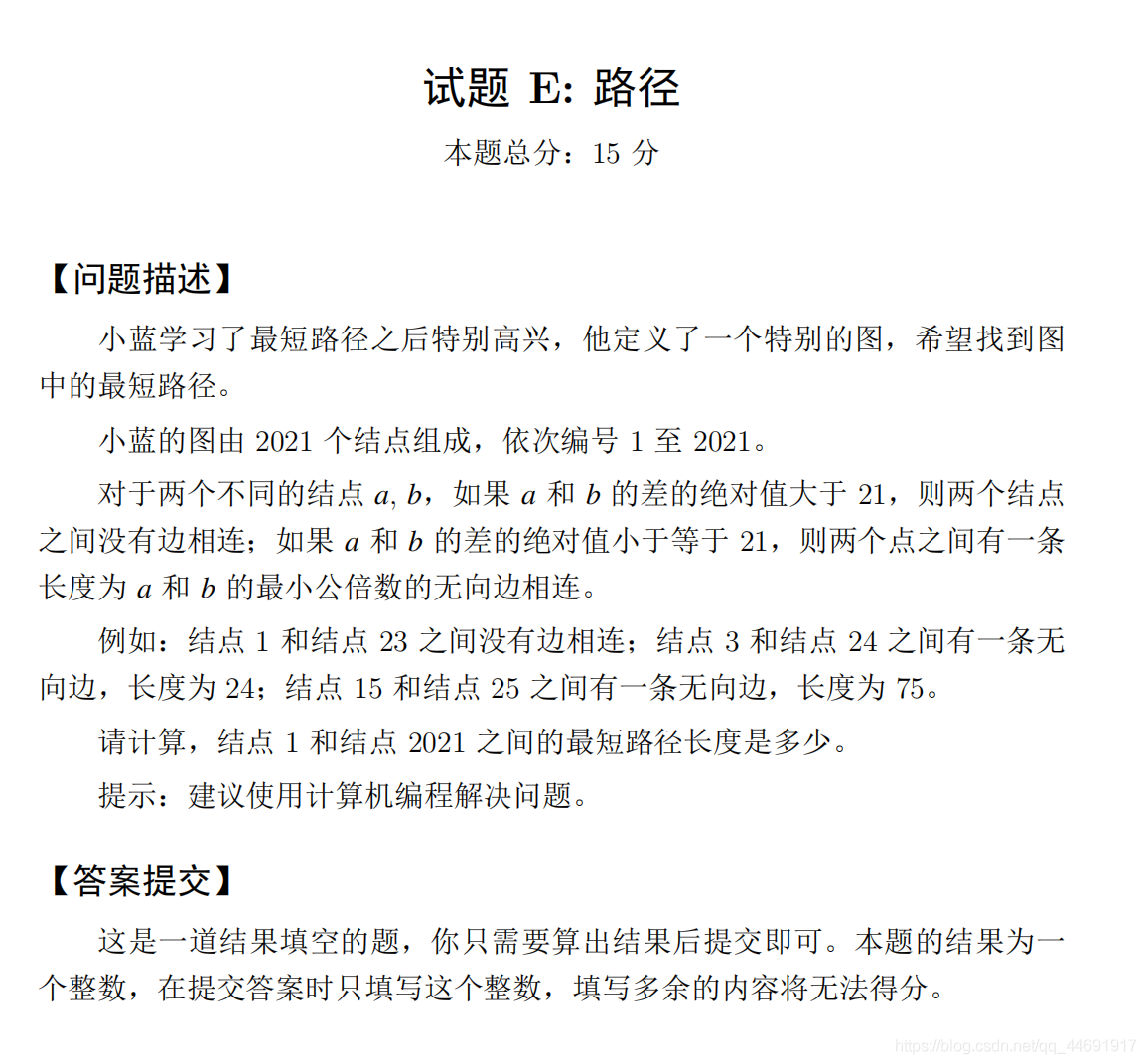 #include<iostream> #include<queue> #include<cstring> using namespace std; const int maxn = 10000005; int gcd(int a, int b) { if (b == 0)return a; else return gcd(b, a % b); } int lcm(int a, int b) { int u = a * b; return u / gcd(a, b); } struct node { int to, next, w; }edge[maxn]; int head[maxn]; int cnt = 0; void addedge(int a, int b, int c) { edge[++cnt].to = b; edge[cnt].next = head[a]; edge[cnt].w = c; head[a] = cnt; } struct dis { int bian, dist; bool operator<(const dis& b)const { return dist > b.dist; } }; priority_queue<dis> q; bool vis[maxn]; int D[maxn]; void djstl(int s) { memset(D, 0x3f3f3f3f, sizeof(D)); D[s] = 0; q.push({ s,0 }); while (!q.empty()) { int x = q.top().bian; int value = q.top().dist; q.pop(); if (vis[x])continue; vis[x] = true; for (int i = head[x]; i; i = edge[i].next) { int y = edge[i].to; if (!vis[y] && D[x] + edge[i].w < D[y]) { D[y] = D[x] + edge[i].w; q.push({ y,D[y] }); } } } } int main(void) { //for (int i = 1; i <= 2021; i++) //{ // int rec = i; // for (int j = -21; j <= 21; j++) // { // if (rec + j >= 1 && rec + j <= 2021 && rec + j != rec) // { // addedge(rec, rec + j, lcm(rec, rec + j)); // } // } //} for (int i = 1; i <= 2021; i++) { for (int j = 1; j <= 2021; j++) { if (abs(i - j) <= 21) { addedge(i, j, lcm(i, j)); } } } djstl(1); cout << D[2021]; return 0; }