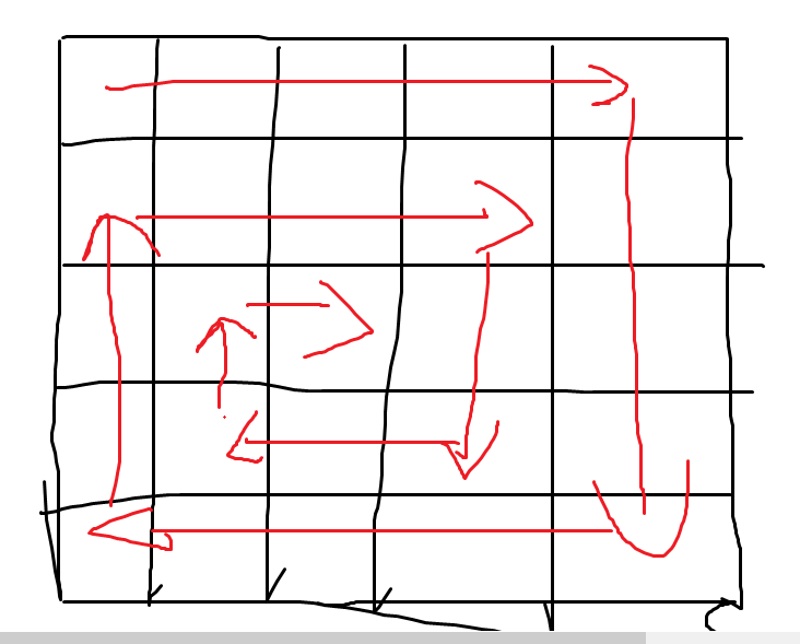 整体思路:如上图一样,从第一行第一个开始移动然后如此往复,每一次循环内部移动四次,每次一行或者一列,先向右,再向下,再向左,再向上,将这四个步骤不断循环直到所有格子全部填充完,但要考虑边界问题,每次枚举完一行或者一列行下标或者列下标会超出边界一个距离所以要减一
