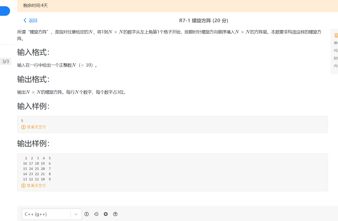 #include<iostream> #include<algorithm> #include<cstdio> using namespace std; const int N = 15; int g[N][N]; int n; void print()//打印最后结果 { for(int i =1;i<=n-1;i++) { for(int j = 1;j<=n;j++) { printf("%3d",g[i][j]); } cout << endl; } for(int i = 1;i<=n;i++) printf("%3d",g[n][i]); } int main(void) { cin>>n; int st = n*n;//总数 int cnt = 1;//计数 int i = 1,j = 1; while(cnt-1 != st)//因为是后缀加所以最后结束一定是cnt == n^2+1;比如n==5那么最后结束cnt==26 { while(!g[i][j]&&j<=n)g[i][j++] = cnt++;//从第一行开始一直执行到第一行结尾,这个时候的j已经超出了n,所以需要让列减一,让行加一 j--,i++; while(!g[i][j]&&i<=n)g[i++][j] = cnt++;//从第二行末尾开始往下执行执行到最后一行末尾结束,这个时候的行超出了n所以需要减一,让行加一 i--,j--; while(!g[i][j]&&j>=1)g[i][j--] = cnt++;//同上面两个,从最后一行末尾向前执行 j++,i--; while(!g[i][j]&&i>=1)g[i--][j] = cnt++;//同上,从最后一行第一个开始向上循环,不断重复这个过程 i++,j++; } print(); return 0; }