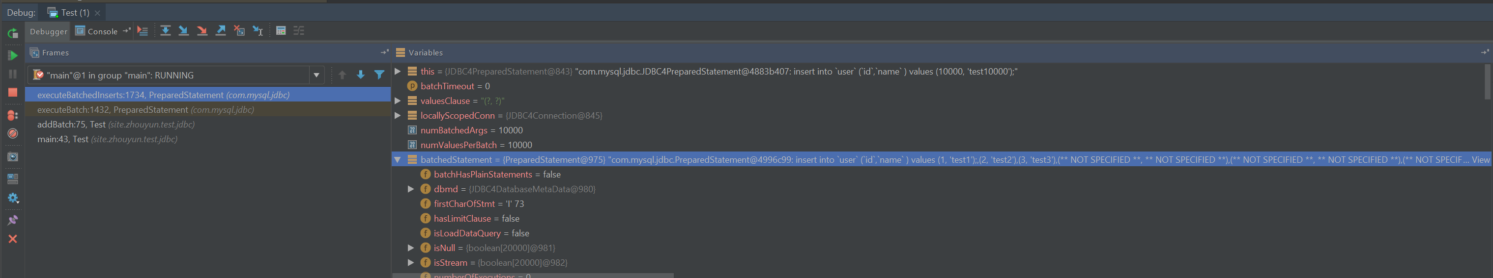 debug调试源码发现加了rewriteBatchedStatements=true会执行 this.executeBatchedInserts(batchTimeout);