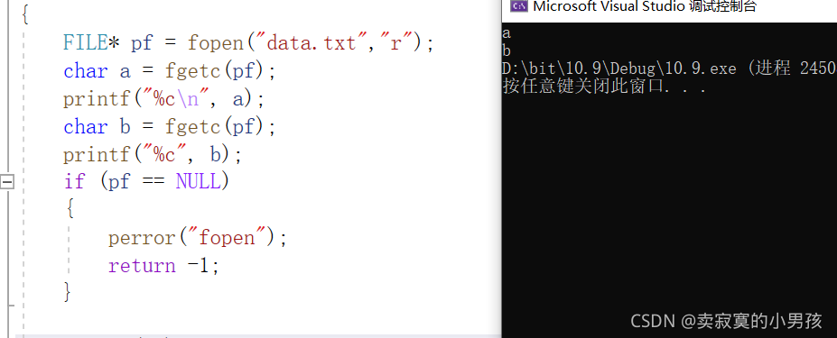 我们发现打印完第一个元素'a'之后,再次调用fgetc则返回的是第二个元素'b',所以fgetc还有让函数指针向后移动的作用,即打印b的时候pf指向的是b。