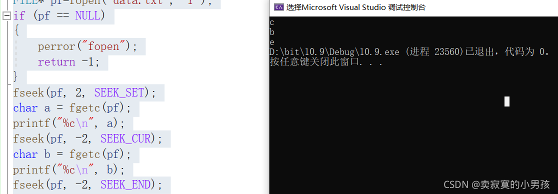 首先fseek(pf,2,SEEK_SET)的含义是,以文件起始位置为基准,文件指针pf指向偏移量为2的位置,即指向的是c,注意a的偏移量是0.