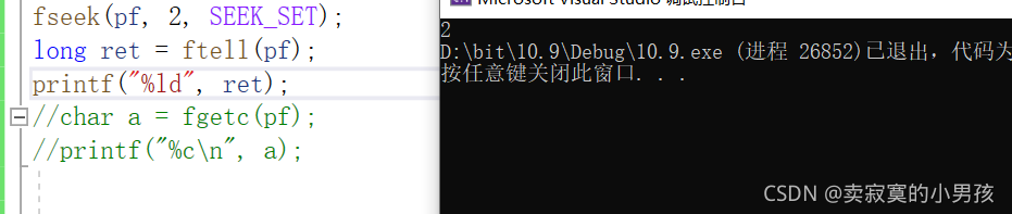 fseek将文件指针定义到相对于起始位置为2的位置,ftell计算出文件指针相对于起始位置的偏移量是2。