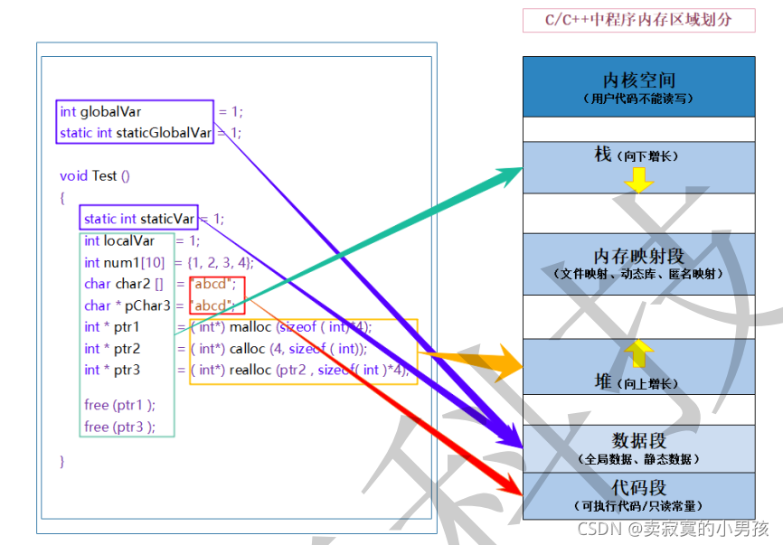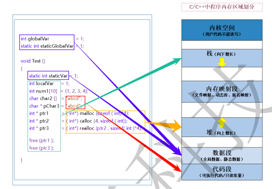 大家看这样一幅图片,我们通常定义的变量是在栈区为他分配空间,而如果使用malloc,calloc,realloc这样的函数就是在堆区为他开辟空间。