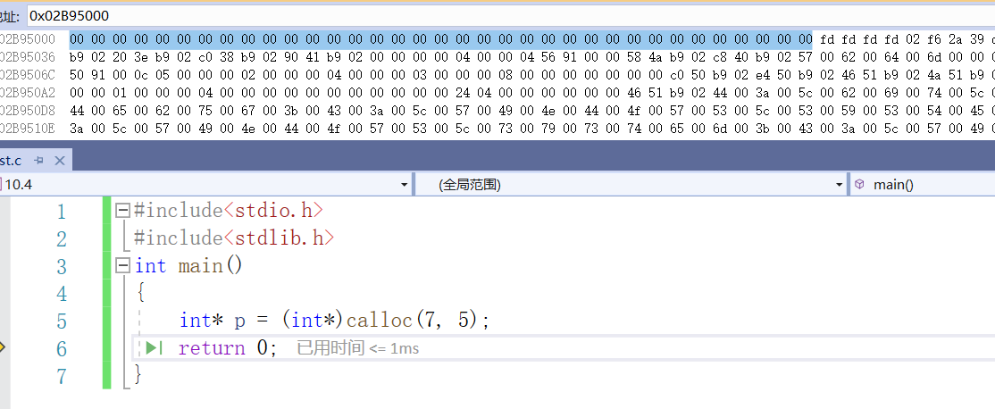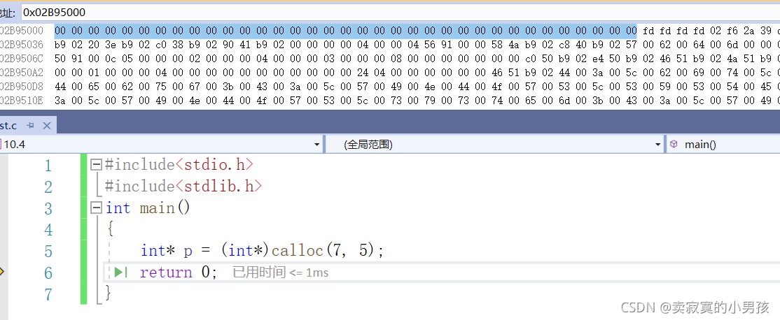 int* p = (int*)calloc(7, 5);//开辟七个元素,每个元素大小为5个字节