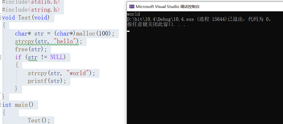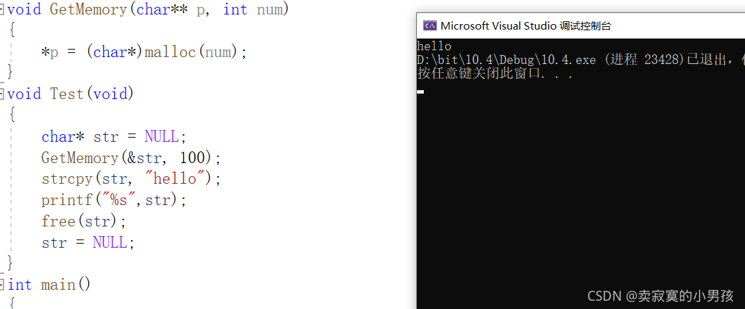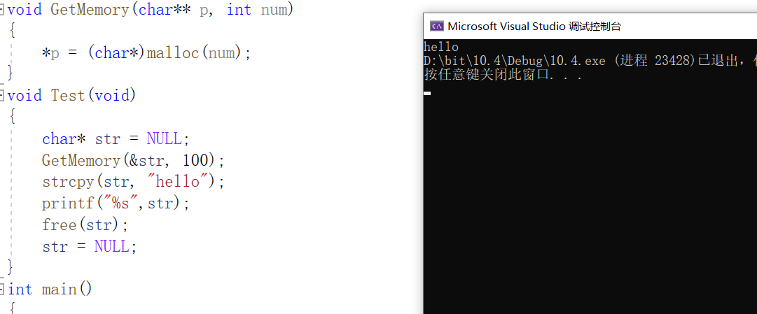 虽然打印出来了结果是hello,这里传递的是str的地址,用p来接收str的地址,对str地址解引用得到str本身,使str指向100个字节大小的空间,然后销毁p的空间。销毁的意思是不在程序中默认不能访问str的地址了,不过没关系,因为str已经指向了我们想让他指向的内容。