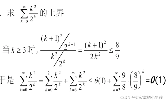 同样的套路,先用a(k+1)/ak得到一个表达式,寻找从哪一项开始这个表达式是小于1的(因为我们已经猜测表达式的上界是O(1)),然后将它们拆开,前一项是一个常数,不用管,后一项的值始终小于1,因此它的上界是O(1)。