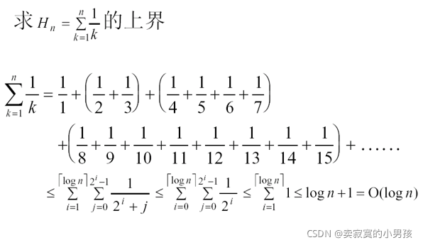 这题是所有题中最让我懵逼的一道,没点数学基础真不敢出来混。观察这组数据,每一个括号中第一个数是2的倍数,每个括号含有的项数也是二的倍数,这两个二的倍数是相等的。这里的i代表有多少组数据,设有m组数据则1+2^1+2^2+....2^(m-1)=n所以解出m=log(2)(n+1),下面是2,上面是(n+1),所以第一个不等式成立(吐槽一下这题老师是念ppt讲的,连log下面的2没了都没发现),前一个Σ符号表示的是有几组数,后面的Σ符号表示的是每一组数加起来,1/(2^i+j)表示的是每一个数,这样你是不是就通透了呀。