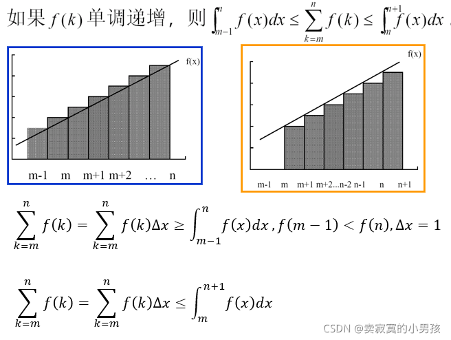 第二个图我认为画的有点问题,我们还是按照第一个图来理解,当除去相同的部分之后,散点图剩下(n-m)个小三角,积分图剩下最后一个梯形,将小三角往梯形里填充,很明显发现它们的面积和是小于梯形面积的(注意我们目前研究的是递增函数),当n时常数的时候也是如此。