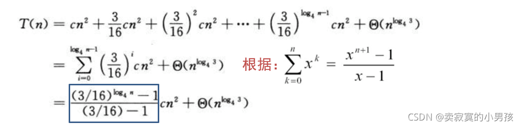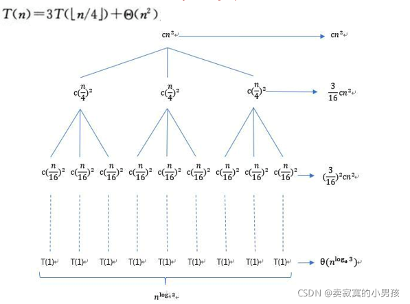 首先T(n)包含四个部分,前三个部分是T(n/4)[向下取整],即树的分叉部分,最后一个部分是树根部分,即为Θ(n^2)部分,由于所有的树的分叉部分都代表了一棵树,所以其实最后加起来的部分只有树根部分,对于第一次递归来说,三个树杈部分又是一个树,即T(n/4[向下取整])=3T(n/16[向下取整])+Θ((n/4)^2[向下取整])。而后者等于Θ((n/4)^2),因此它对应的树根节点就是c(n/4)^2,依次类推,知道最终节点变成了T(1)。这是因为原本n是一个很大的数,当走到T(1)时拆分之后的结果就变成了0,无法再分出树杈了。