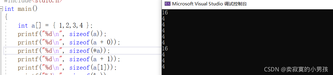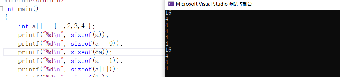 printf("%d\n", sizeof(a));//16 sizeof(数组名)表示的是整个数组所占的字节数,有四个元素都是整型,每个整型的大小是4个字节所以是16。