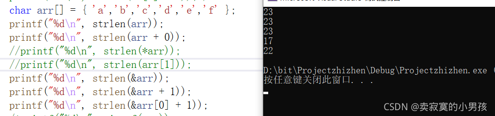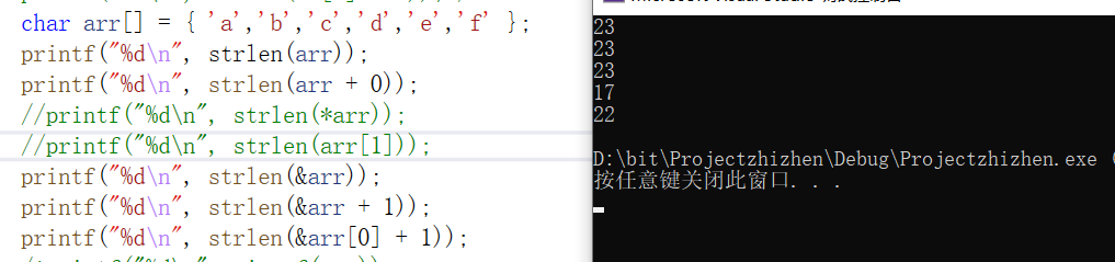 printf("%d\n", strlen(arr+0));//23 和第一个是一样的+0之后没有区别。