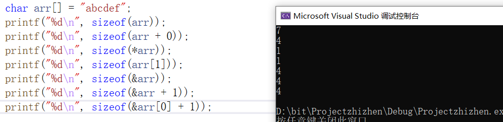 printf("%d\n", sizeof(arr));//7 计算arr所占多少个字节,除了6个元素之外还有一个'\0'共7个字符型变量,共占7个字节。