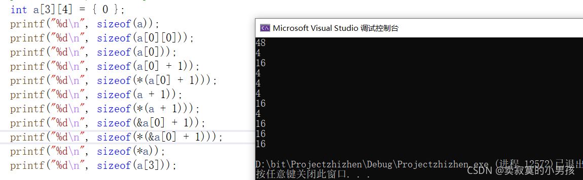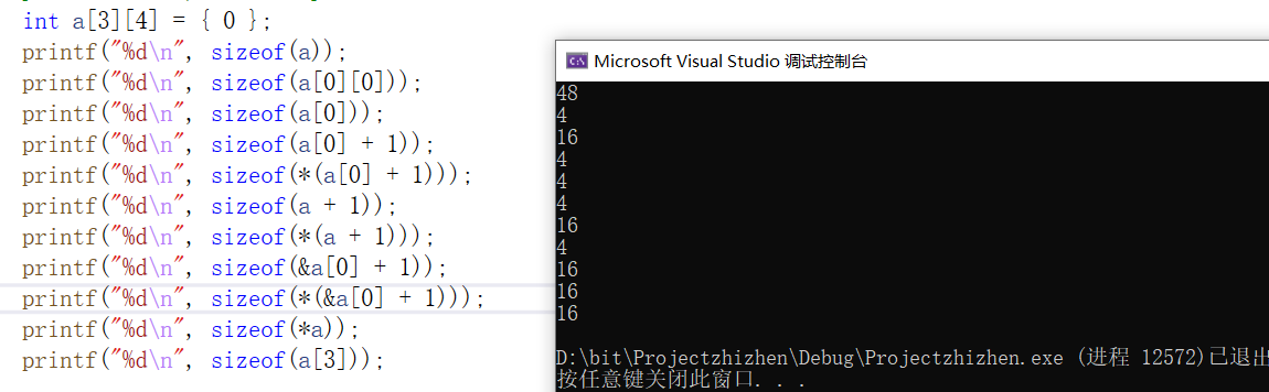 printf("%d\n", sizeof(*a));//16 对第一行元素解引用,计算的是第一行元素所占空间大小是16个字节。