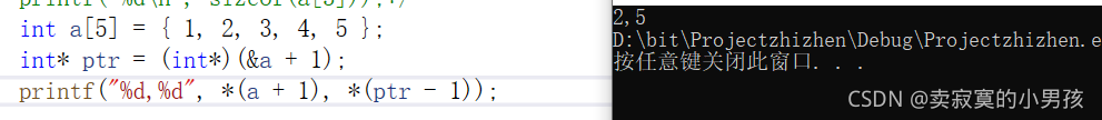 首先分析ptr1,&a表示的是整个数组的地址,再+1表示的是跳过整个数组大小的内存,即此时(&a+1)表示的是数组a的最后一个元素的下一个元素,由于&a表示整个数组,所以此地址表示的是从该元素开始向后数,大小为a的大小的数组的地址。再将其强行转换为int*类型,得到的就是该元素的地址,要打印的是ptr[-1],等价于*(ptr-1),ptr-1指向的是数组a的最后一个元素,再对其进行解引用的到最后一个元素4。