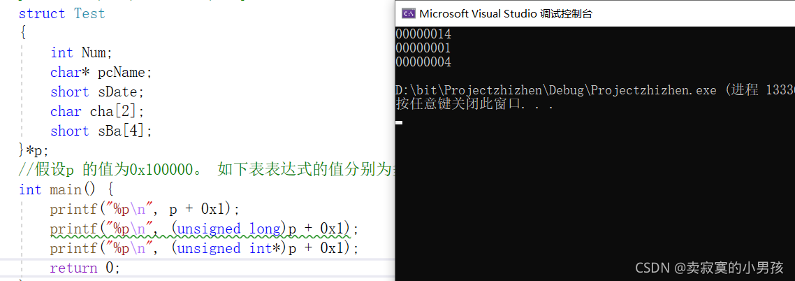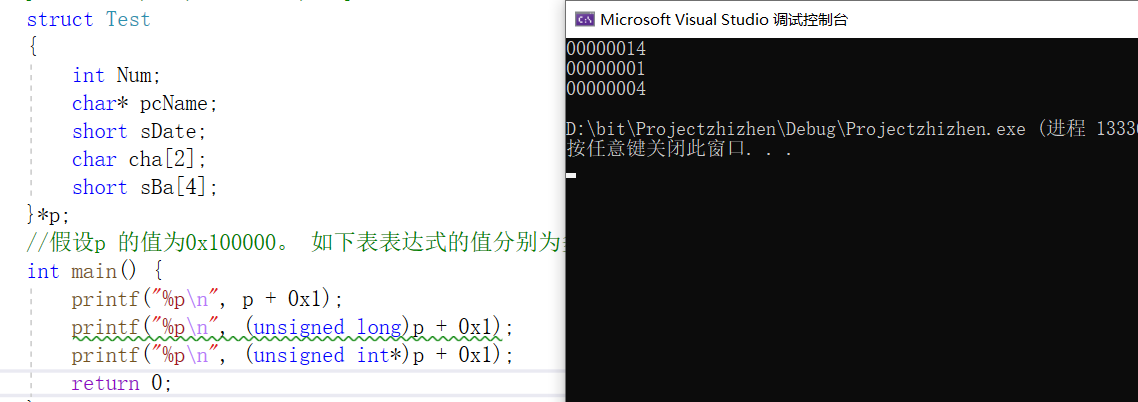 首先p是一个指向结构体的指针,所指向的结构体占20个字节,指针加减整数和指针类型有关,所以指针加1之后,跳过20个字节,在16进制中20表示为0x00000014所以打印出来这个结果。