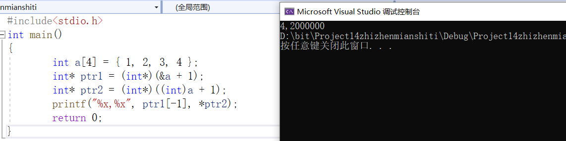 然后分析ptr2,首先a代表首元素的地址,将它转换成int类型,即将首元素地址转化成了代表地址的二进制序列的那个数。