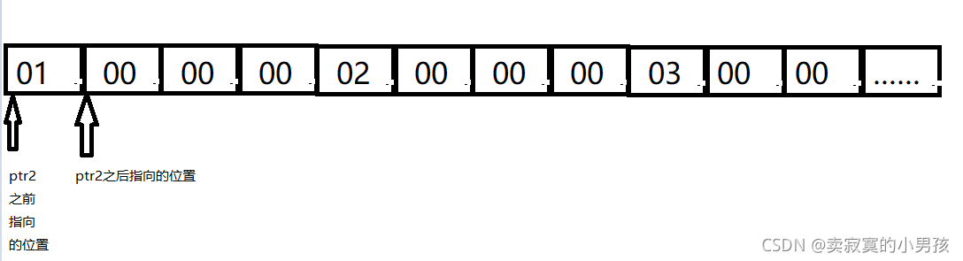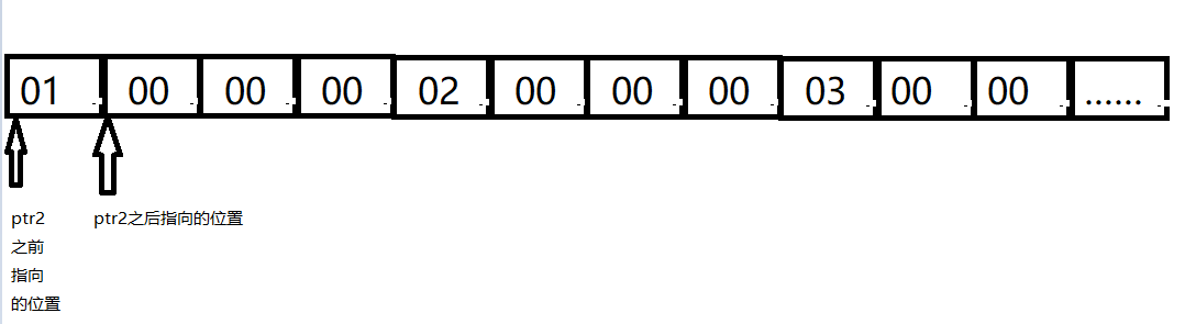 假设a的地址原来是1122ff33,那么a的地址整型化之后再加一,就得到1122ff34,我们知道每一个二进制序列代表一个字节,所以地址加一后代表a的首元素地址的下一个字节(看图更清晰呀!),在将这个数强行转化成int*型,即又将其转化成了一个地址,而ptr2就指向这个地址。找到了这个地址也就找到了ptr2。在根据是以整型的方式打印,所以从ptr2开始数4个字节,打印的就是这4个字节所代表的数。即00 00 00 02代表的16进制数是02 00 00 00,所以打印的是2000000。