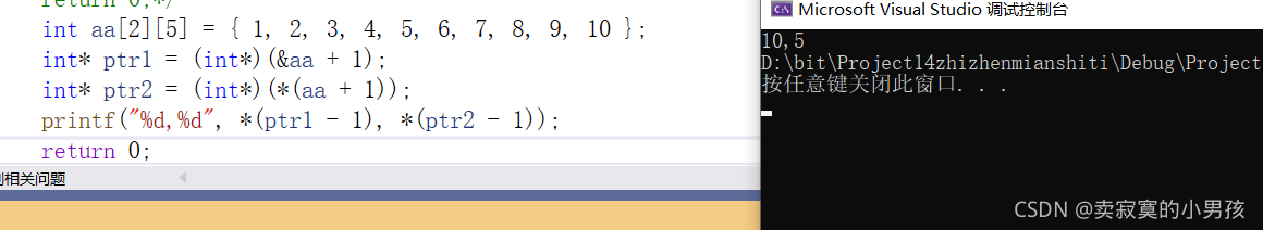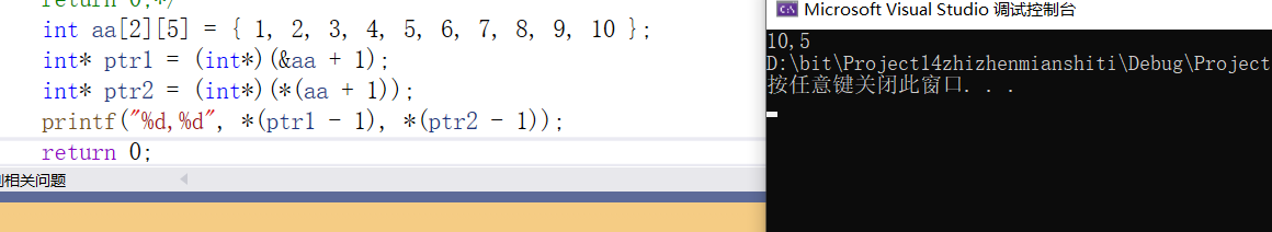 &aa拿到的是整个数组的地址,此时表示的是首元素的地址,+1拿到的是10之后的元素的地址(注意这个地址表示以该元素为起点,和aa数组一样大的数组的地址),强行转化成int*型才真正拿到10之后的那个越界元素的地址,即为ptr1的指向。在对其-1拿到的是10的地址,解引用打印出来的是10。
