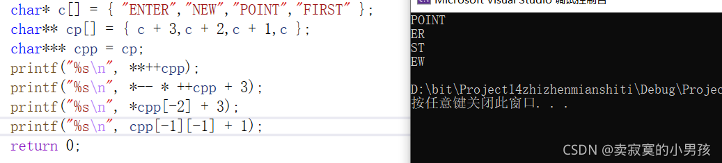 首先分析**++cpp,对cpp++即cpp指向了c',对cpp解引用得到了c',再对c'进行解引用得到了c也就是P的地址,对其进行%s打印得到字符串POINT。