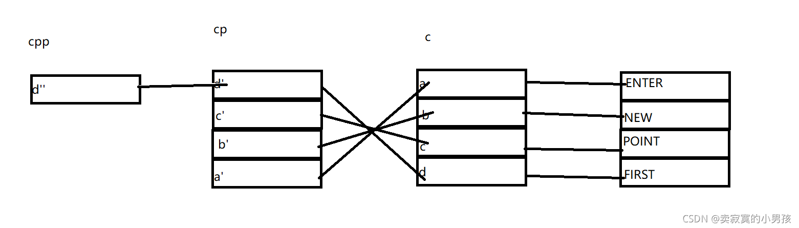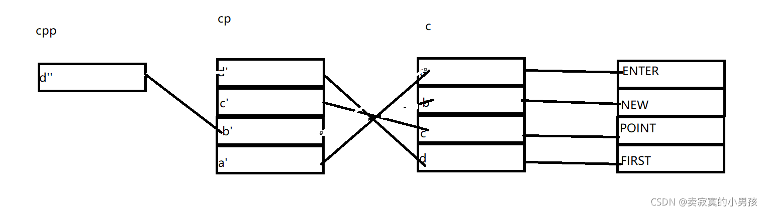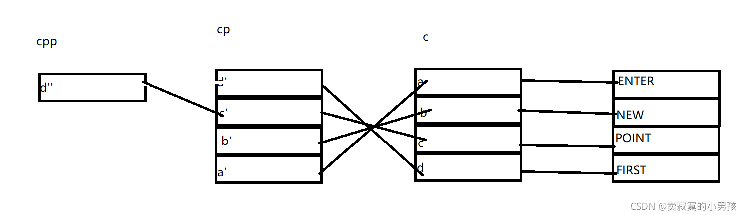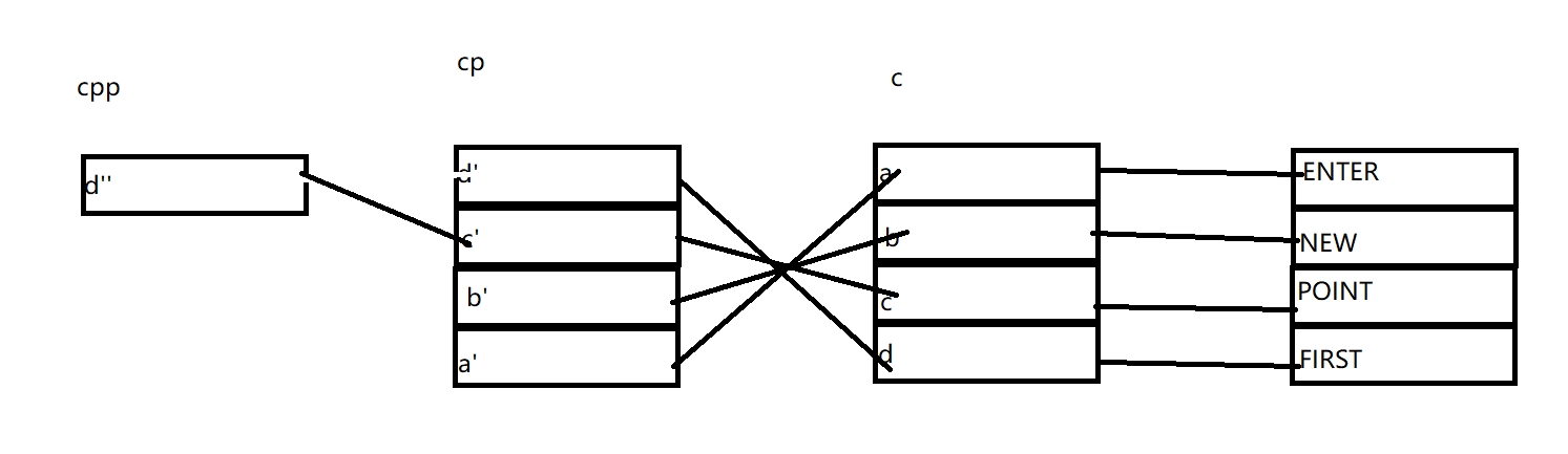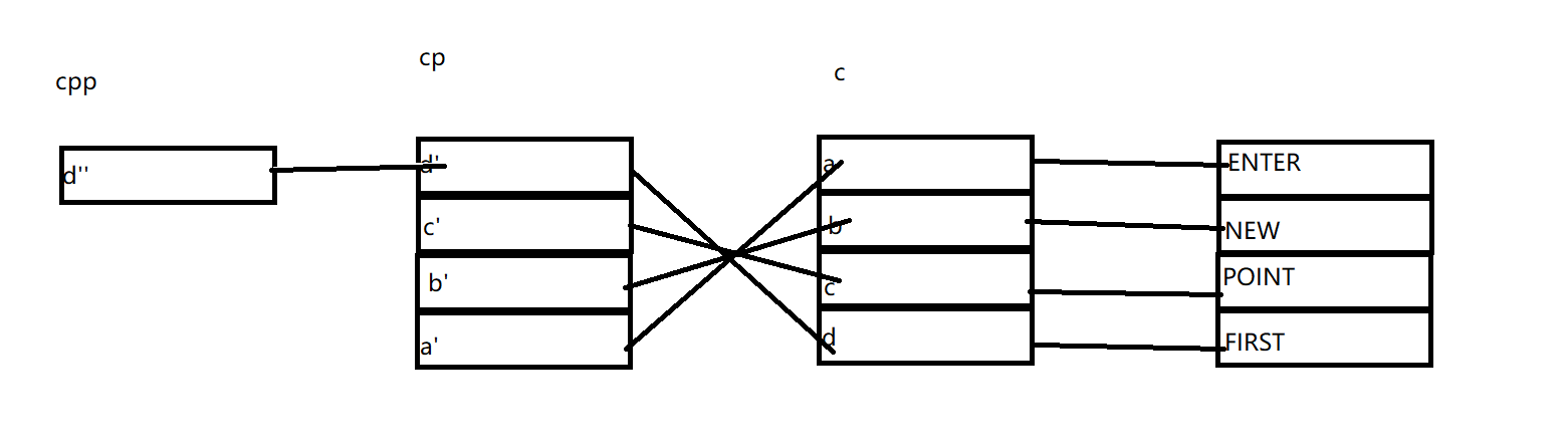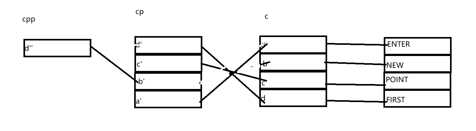 从左到右依次是指向关系,c数组中a元素指向ENTER,cp中a'指向a依次类推。