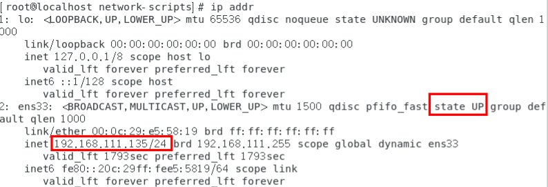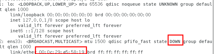 用ip addr查看网卡信息并对照一下上图,可以知道网卡ens33就是我们要配的网卡,且网卡状态是down