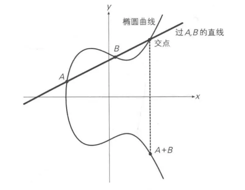 1.曲线上A、B不同两点相加,过A、B两点画一条直线,找到直线与椭圆曲线的交点,交点关于x轴对称位置的点,定义为A+B,即为加法。如下图所示:A + B = C