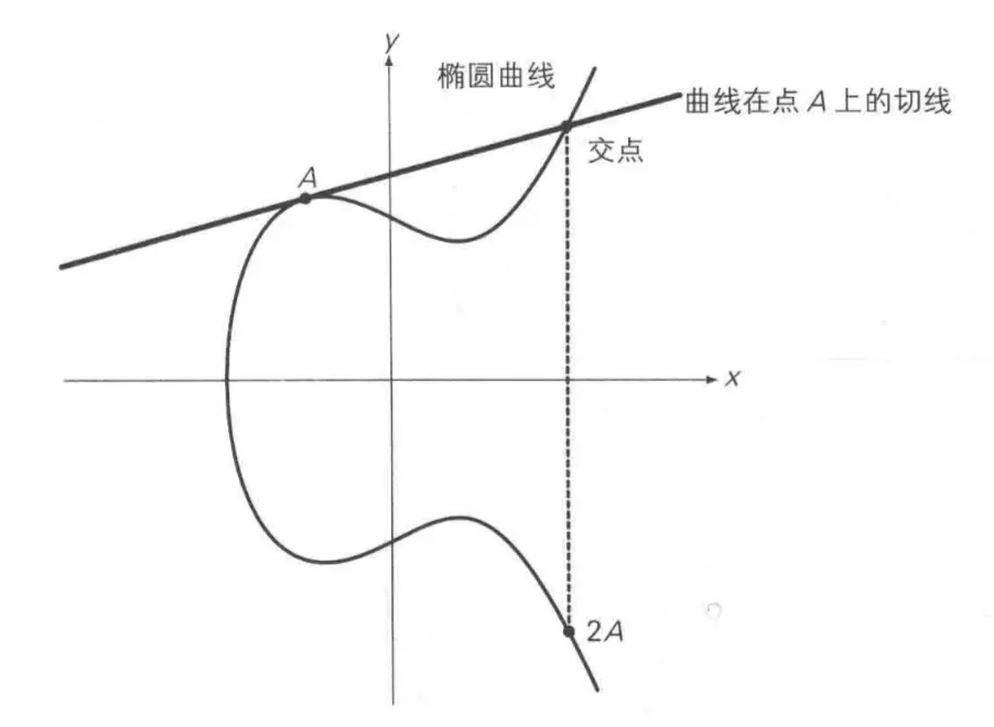 2.相同点A与A相加,过A点做切线,与椭圆曲线的交点,交点关于x轴对称位置的点,定义为A + A,即2A,即为二倍运算。