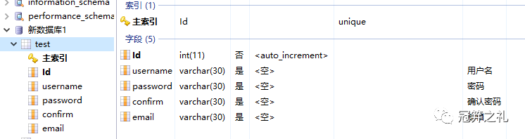 1.我先在数据库建立一个表单,并设置了对应的字段(类型、默认值。备注)