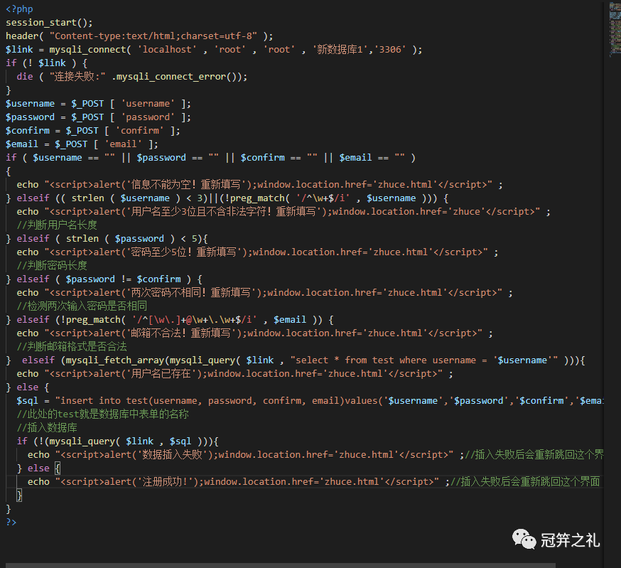 2. php文件,我们在html页面填写的数据就是被传输到这个文件。.php文件实现了对html页面提交的数据的接收,并且连接数据库,将数据传输到数据库中存储起来(即将数据赋予对应数据库中对应表单里的对应的字段变量)