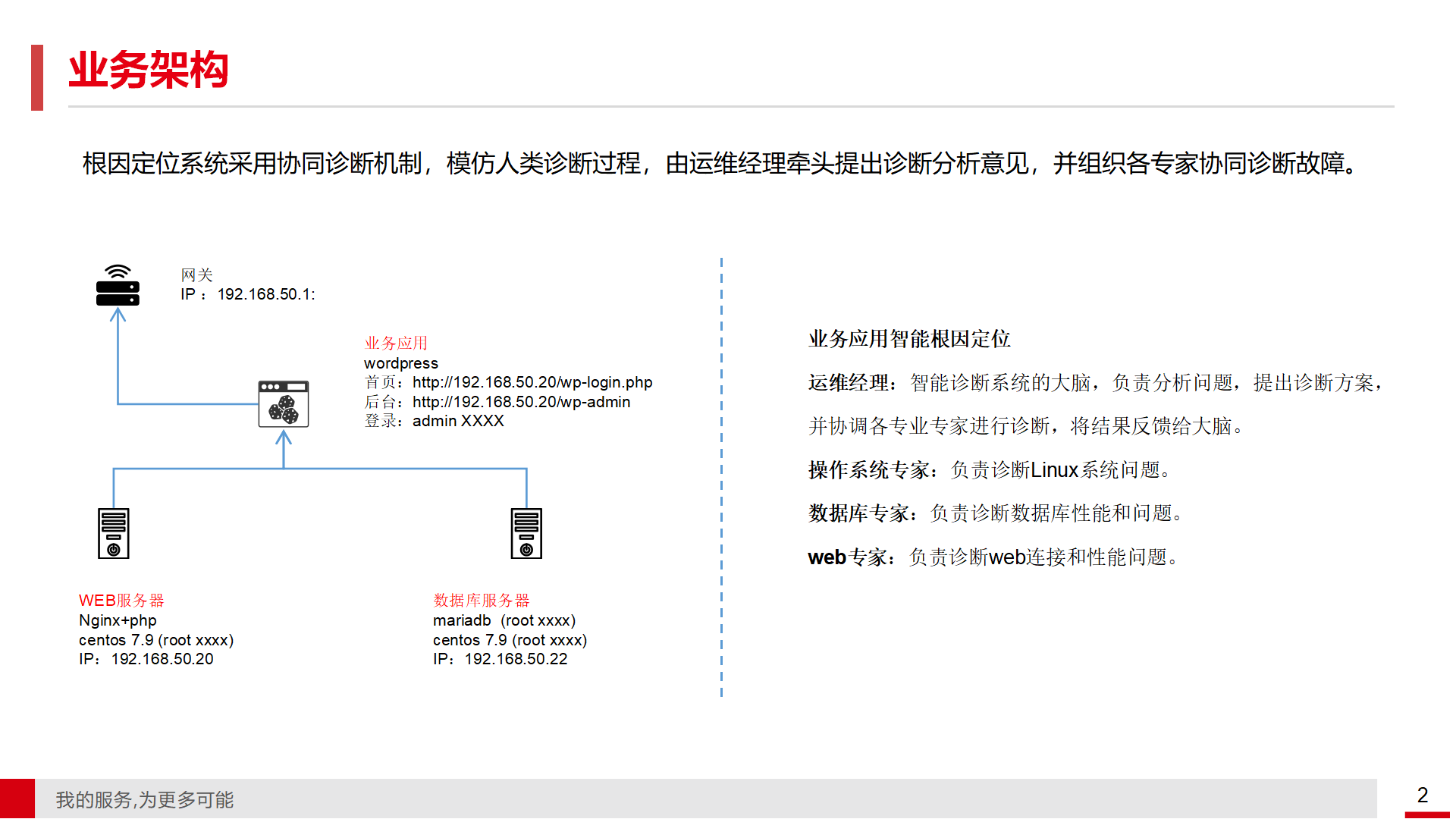 • 多agent故障更新定位工具介绍 该工具在第一讲介绍的单对象诊断工具的基础上进行了升级,能够对综合业务系统进行故障诊断。通过模仿人类联合排障的方式,由运维经理提出问题并协调各领域专家(如Web专家、操作系统专家、数据库专家)进行联合排查,直至找到问题的根因。