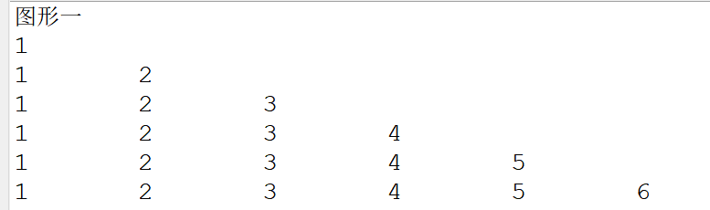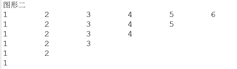 System.out.println("图形二"); for(int i = 6 ; i >= 1 ; i--) { for(int j = 1 ; j <= i ; j++) { System.out.print(j+"\t"); } System.out.println(); }