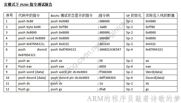 根据测试报告,我们可以归纳出32位保护模式下,针对NASM编译器的push指令用法: