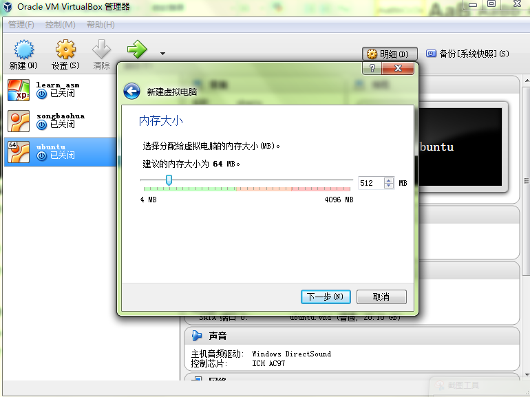 内存大小就根据自己主机的物理内存来配置吧,这里我选了512M,然后点击【下一步】;