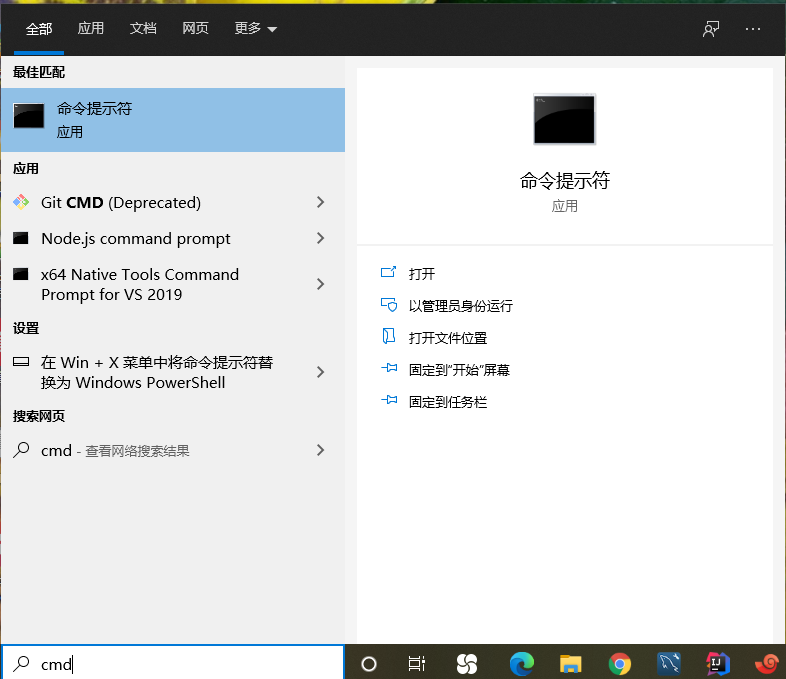 点开开始菜单,在搜索框中输入“cmd”,在搜索结果中,对着命令提示符程序,单击鼠标右键,菜单中点击选择“以管理员身份运行”。