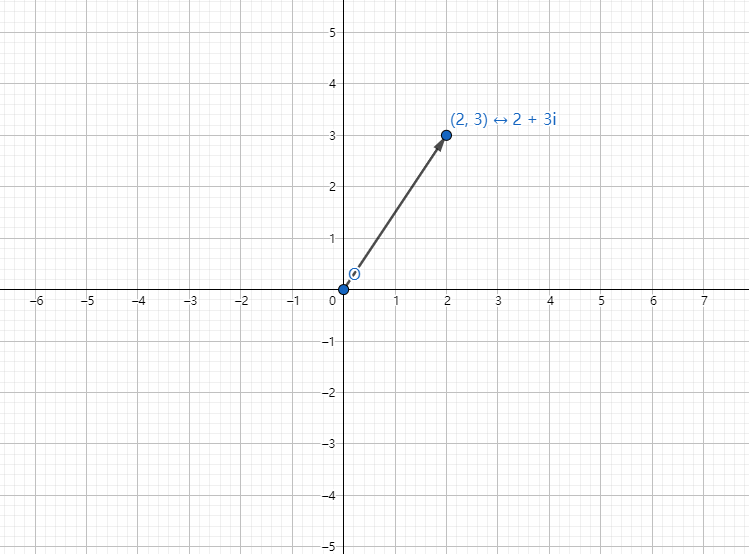 真是奇怪的数……一个复数一般用形如 \(a + bi\) 的形式表示。正如实数对应着数轴上的点一样,每一个复数与平面上的一个点 \((a, b)\) 对应。这个平面被称为“复平面”。图中 \(2 + 3i\) 就对应着点 \((2, 3)\)。