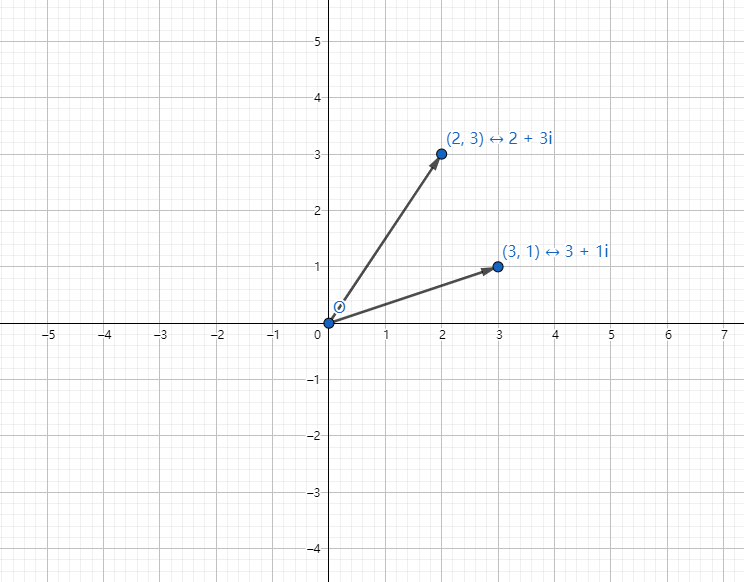 如图,有两个复数 \(2 + 3i\) 和 \(3 + 1i\)。