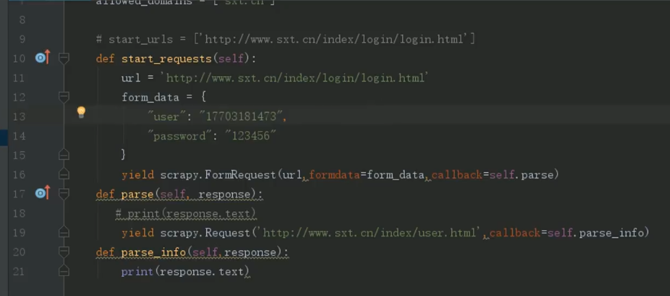 class ProxyMiddleware(object): PROXY_LIST = [ 'http://106.14.255.124:80', 'http://221.181.238.59:9091', 'http://124.204.33.162:8000', ] def process_request(self, request, spider): print('-----开始检测代理 ip') # 随机挑选ip request.meta['proxy'] = random.choice(self.PROXY_LIST) return None def process_response(self, request, response, spider): print('-------> 检测', response.status) if response.status != 200: request.dont_filter = True print('-----ip不可用------', request.meta['proxy']) return request return response