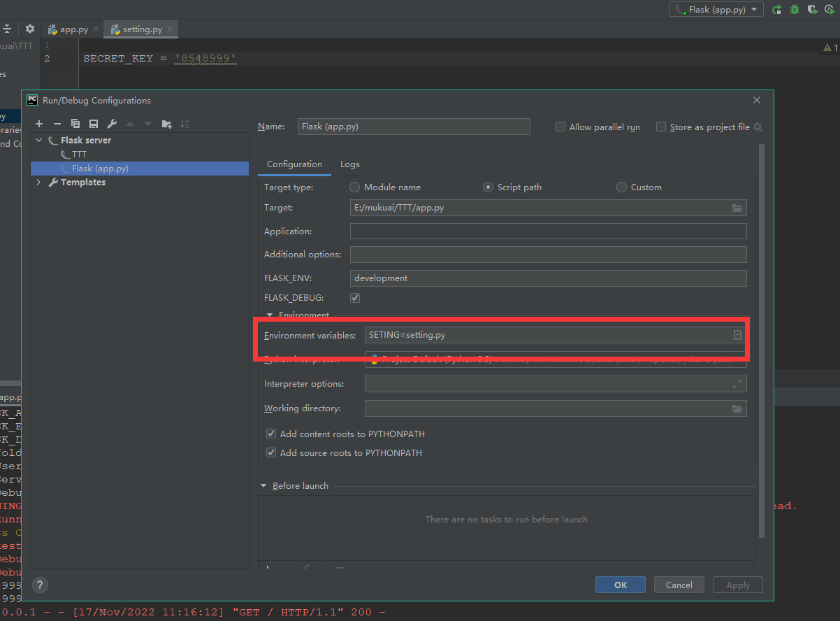 app = Flask(__name__) # 引入第一种配置 app.config.from_object(FirstConfig) @app.route('/') def hello_world(): # 从配置读取文件 方法1 print(app.config['SECRET_KEY']) # 从配置读取文件 方法2 print(app.config.get('SECRET_KEY')) return 'Hello 数据测试!' if __name__ == '__main__': app.run()