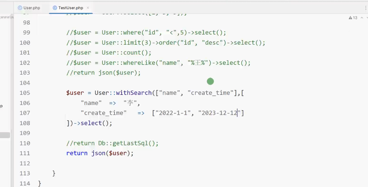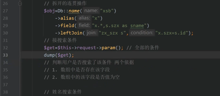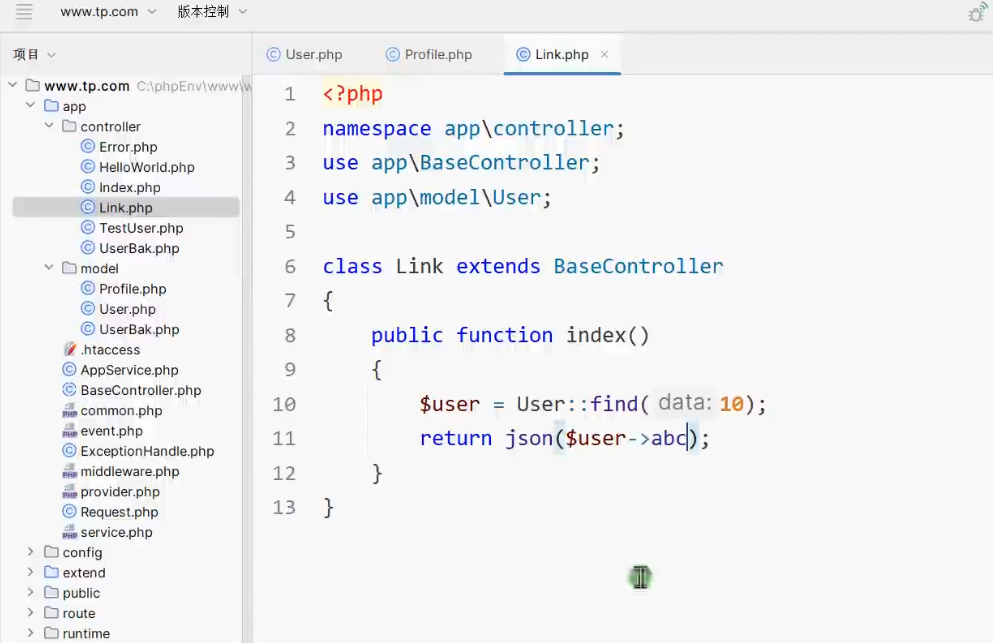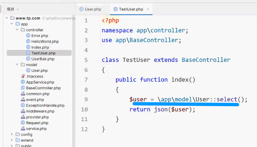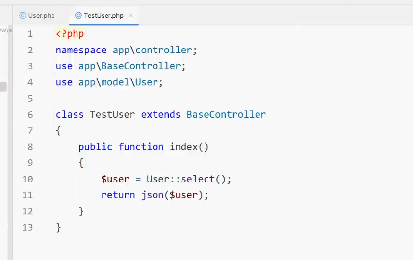 { // 连接user表,查询 Suser = Db::table("user")->select(); // 输出数据 return json($user),