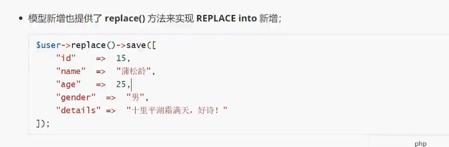 模型新增也提供了 replace()方法来实现 REPLACE into 新增;