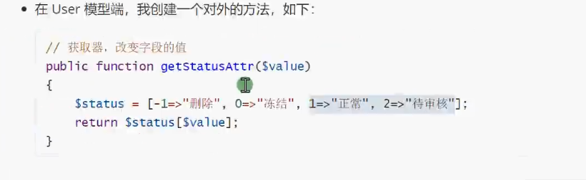 而页面上,我们需要输出 status 字段希望是中文,就可以使用获取器